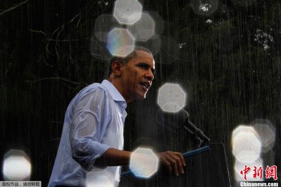 2012年美国大选结果于当地时间7日凌晨出炉。奥巴马目前已经获得274张选举人票,成功连任。图为当地时间2012年7月14日,美国总统奥巴马在维吉尼亚州参加竞选活动,发表演讲时突降大雨。(资料图)中新社发吴庆才 摄