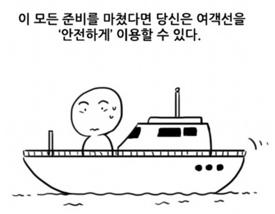 漫画内容包括“买票之前要确认船长是否是正式工人,是否是代理船长”,“上船前要确认船体有没有改造过”,“要提前自备能够测算经纬度的GPS仪器”,“上船之后马上确认救援设备和安全通道的位置”,“要数一数救生衣够不够分”,“乘船前至少学3个月的游泳”,“要挑选离船员最近的房间”,“乘船当中如果有异响,一定要立刻跑到甲板上”,“如果让大家留在船舱,那么一定是出事了”等等。最后一张漫画写着这样一句话:“只有熟知以上要点,你才能在韩国安全乘船”,引人苦笑。