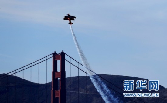 美国“甲骨文”特技飞行队的一架飞机在飞行表演中飞越金门大桥。新华网发(董旭东摄)