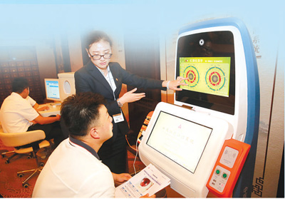 7月6日,金砖国家卫生部长会暨传统医药高级别会议在天津召开,参会人员体验中医综合检测系统。