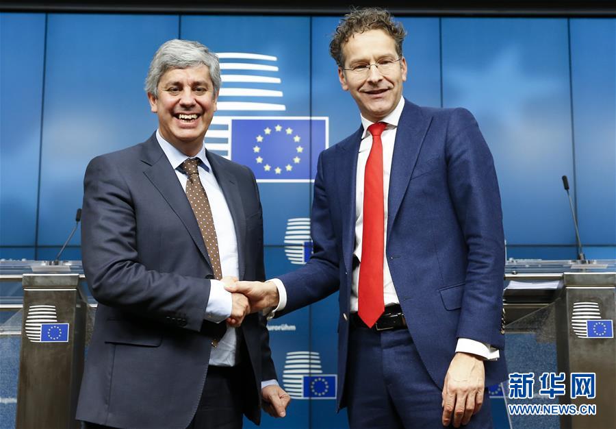 当地时间12月4日,在比利时首都布鲁塞尔欧盟总部,欧元集团新当选主席、葡萄牙财政部长马里奥·森特诺(左)与现任主席戴塞尔布卢姆握手。