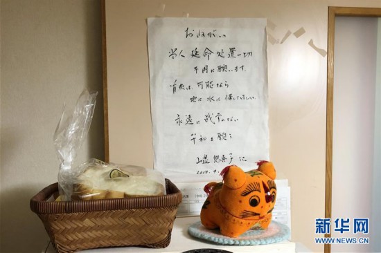 这是8月12日在山边悠喜子位于日本东京的家中拍摄的贴在墙上的纸,纸上写着:“请不要对我采取任何延长寿命的措施;如果可能的话请把我的骨灰归入大地或河流;祈祷没有战争,永久和平。”新华社记者 冮冶 摄