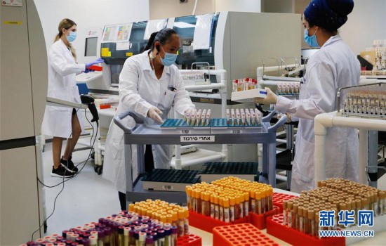 9月13日,在以色列中部城市奥尔耶胡达的一处实验室,技术人员进行新冠病毒血清学检测。新华社发(吉尔·科恩·马根摄)