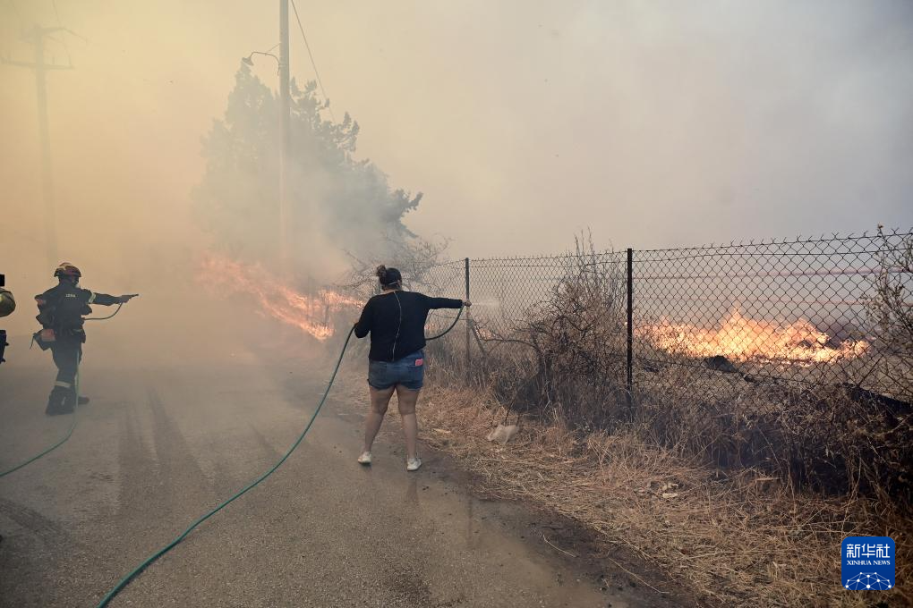 8月8日,希腊首都雅典东南约35公里的凯拉泰阿镇出现严重火情,居民和消防员奋力灭火。
