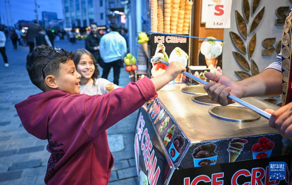 11月19日,两名儿童在伊斯坦布尔独立大街上体验土耳其冰激凌戏法。