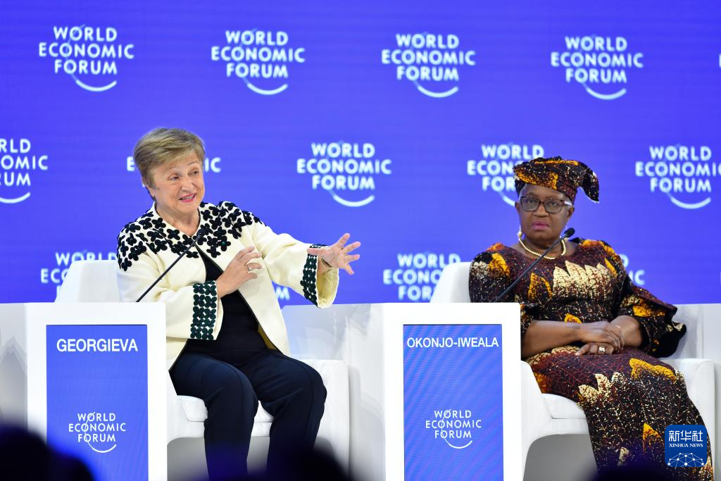 1月23日,国际货币基金组织总裁格奥尔基耶娃(左)在瑞士达沃斯举行的世界经济论坛2026年年会上发言。
