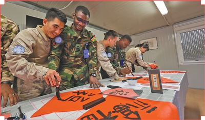 从“福”字寓意到春联的内涵,从横竖撇捺到结构布局,战士们耐心讲解、手把手示范如何写“福”字,外国友人认真临摹,一笔一画尽显专注。大家一同将书法作品高高举起,相互欣赏、合影留念,现场欢声笑语不断。“中国军人以开放包容传播和平与善意。”加纳维和军人安娜徒表示,通过书写汉字,她更真切理解了“福”字承载的平安、团圆与祝福,“这份美好属于每一位守护和平的人”。