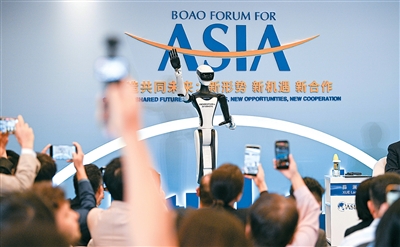 博鳌亚洲论坛二〇二六年年会期间,多元智能设备全方位护航盛会运行,以科技力量赋能智慧办会。图为在年会分论坛上参与互动的人形机器人。 |