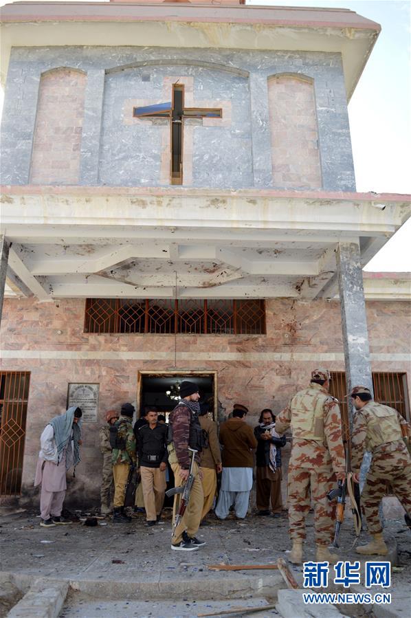 12月17日,士兵在巴基斯坦奎达的受袭教堂外工作。巴基斯坦西南部俾路支省首府奎达一座教堂17日遭袭,现场发生爆炸和激烈交火,已有至少8人死亡。 新华社发(伊尔凡摄)
