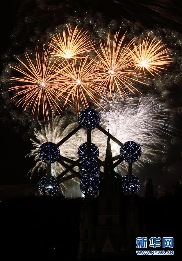 8月24日,在比利时布鲁塞尔,烟花在地标性建筑“原子球”上空绽放。 布鲁塞尔24日举办了一场大型烟花秀。 新华社记者郑焕松摄
