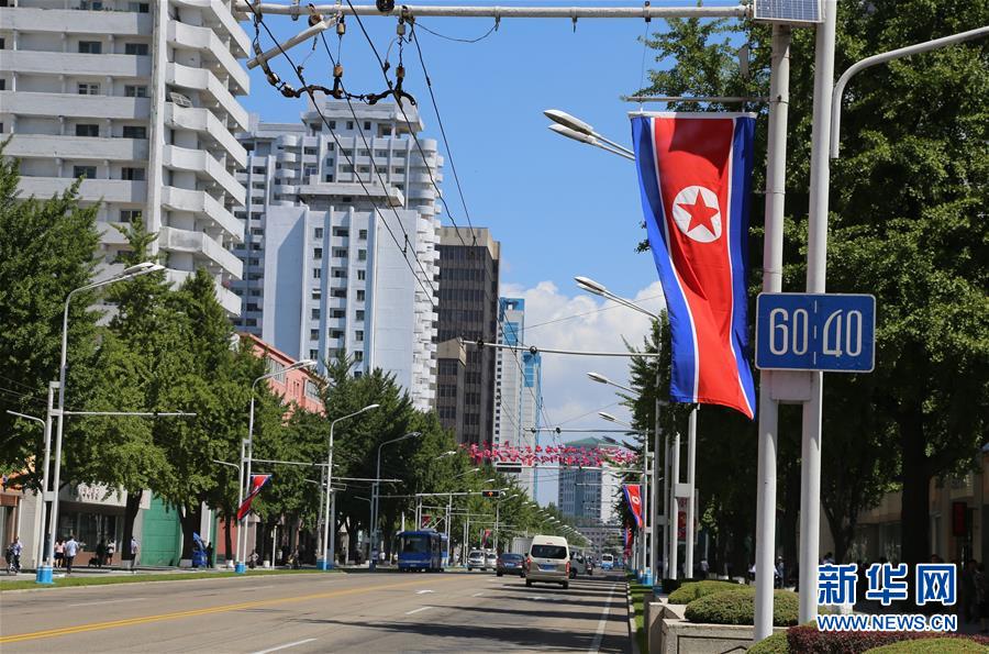 9月8日,朝鲜首都平壤街头悬挂着国旗庆祝国庆。 朝鲜9月9日将迎来国庆70周年。 新华社记者江亚平摄