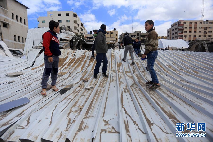 3月15日,在加沙城,巴勒斯坦儿童在空袭过后的废墟玩耍。 新华社发(亚西尔摄)