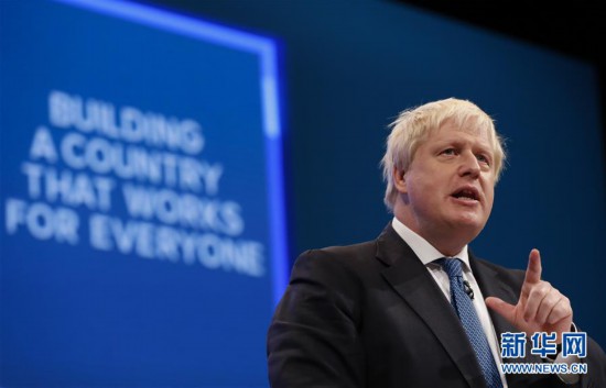 英国前外交大臣、伦敦前市长鲍里斯·约翰逊7月23日当选执政党保守党领袖,将接任英国首相。 这是2017年10月3日,在英国曼彻斯特,时任英国外交大臣鲍里斯·约翰逊在2017年英国保守党年度大会发表主旨演讲。 新华社记者韩岩摄