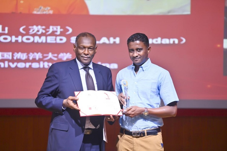 苏丹驻华大使奥马尔·萨迪格为获奖作品导演霍山颁奖。北京师范大学提供图片