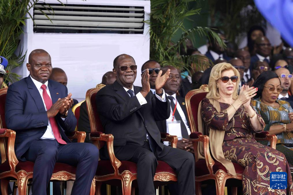 8月7日,在科特迪瓦布瓦凯,科特迪瓦总统瓦塔拉(前中)出席独立日阅兵典礼。