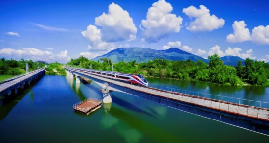 奔驰在老挝万象省境内欣楠里河特大桥的“澜沧号”动车组列车。