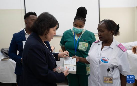 9月24日,四川大学华西医院医生(右二)向莫桑比克马普托中心医院护士讲解捐赠的教学模具使用方法。新华社记者 刘杰 摄