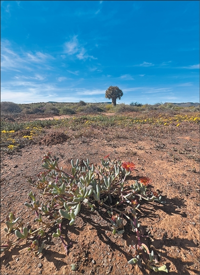 纳马夸兰的土壤中富含铁、锰、锌等矿物质,滋养着1200多种多肉植物,其中近一半是沙漠地带特有的多肉品种(见图二,本报记者邹松摄)。当地日照强烈,大量多肉覆盖的地域呈现出色彩多样的花海。特别是每年的7、8月份,纳马夸兰寂静的沙地里数以万计的花朵纷纷绽放,淡蓝的鸢尾花,金色的野百合,黄色、红色、紫色的非洲菊以及各种叫不上名的野花,荒芜大地化身为万亩花田。依照纳马夸兰地区游客中心的说法,这里的花儿颇具“灵性”,每日最佳观花时段上午10时到下午4时之间,其他时段花儿“下班”。还有一种名叫“二歧芦荟”的树木,其树干被掏空后轻盈而结实,当地原住民将其干燥处理后制作成箭筒,“箭袋树”的名字由此而来。记者驱车曾途经“箭袋树”森林,奇异的景观让人仿佛置身于电影《阿凡达》的场景中。