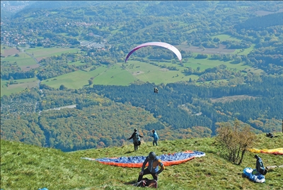 得益于利马涅断层地形及开阔的山顶条件,多姆山还成为滑翔伞、翼装飞行等山地飞行运动的热门目的地(见图一,本报记者于超凡摄)。景区按风向设置多个起飞点,并在山脚划定官方降落场,做到空中与地面活动互不干扰。景区拥有3所常年运营的滑翔伞学校,提供飞行体验和系统教学。飞行教练弗雷德向记者介绍,这里地势开阔、气流稳定、景色优美,飞行的距离刚刚好,既安全又过瘾,非常适合初学者练习,每年有1000多名学员,已成为法国最知名的滑翔伞场地之一。