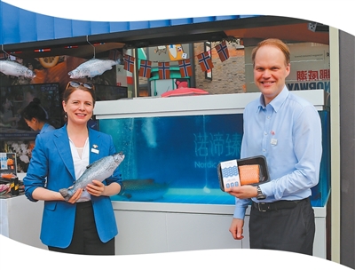 童安睿(右)在“Norway Now挪威潮”市集上,向顾客介绍产自中国东海的养殖三文鱼。 |