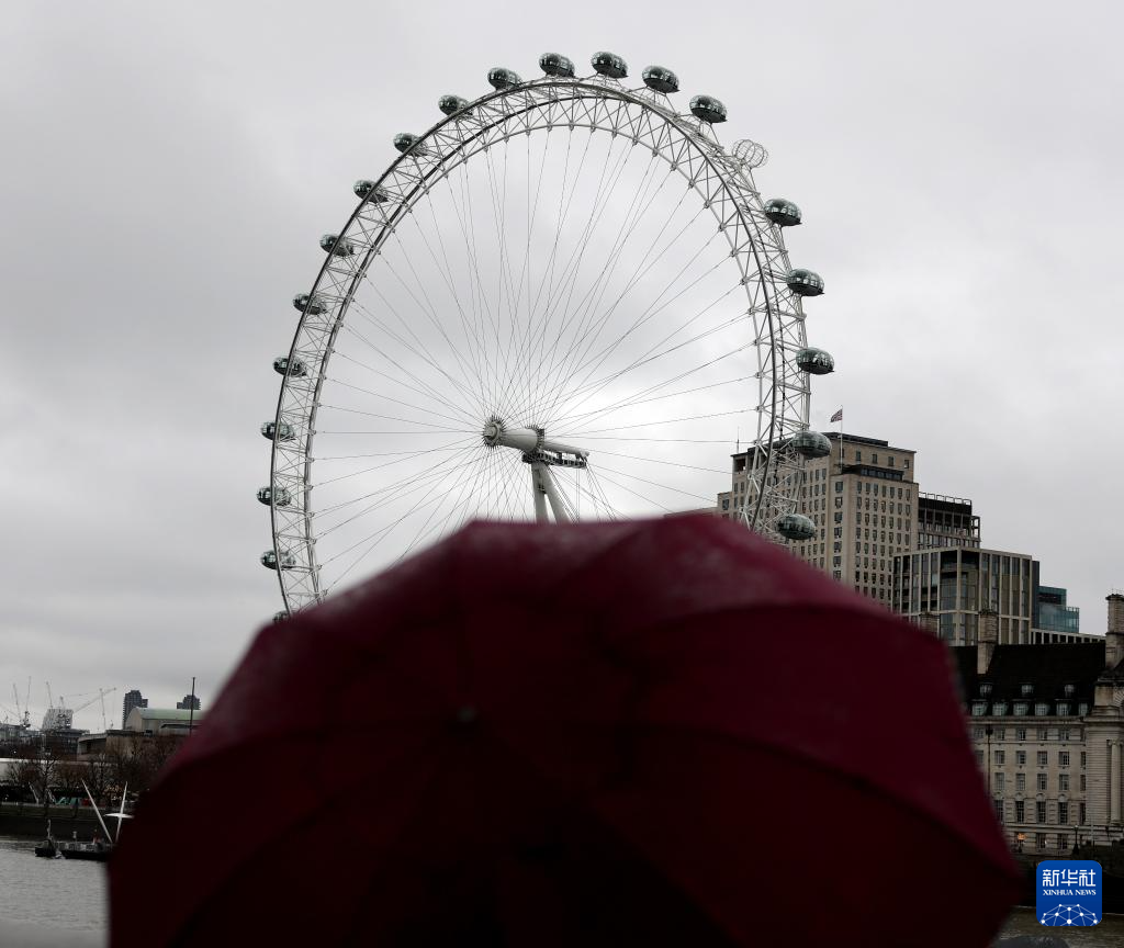 1月27日,一名行人撑伞走在英国“伦敦眼”附近。