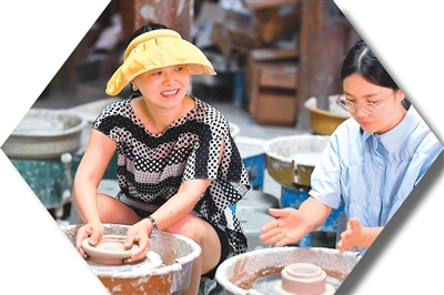 在湖南省长沙市铜官老街,游客正在体验陶瓷制作。 |