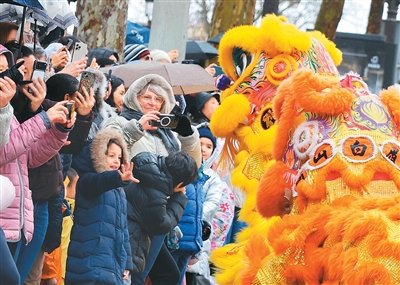 人们在香榭丽舍大街观看醒狮表演。 |