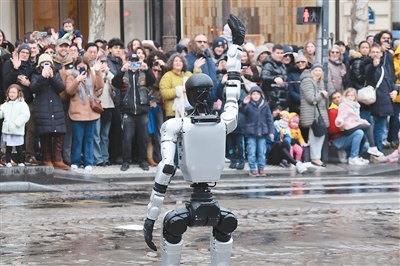 在法国首都巴黎的香榭丽舍大街,由中国企业生产的机器人在巡游活动上向观众挥手。 |