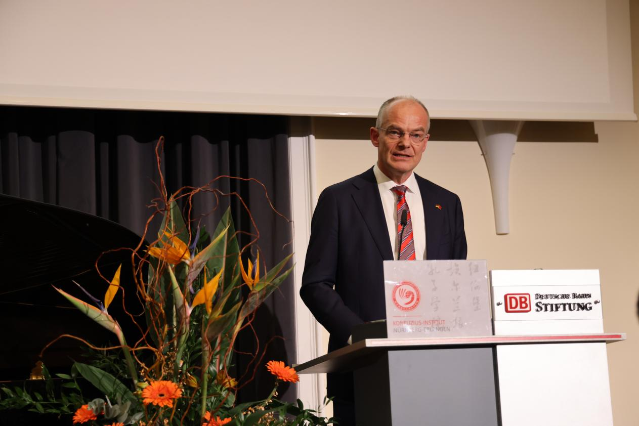 纽伦堡市长代表伯姆随后致辞指出,在全球局势复杂多变的背景下,城市层面的合作愈发显现其务实而稳定的价值。作为德国南部重要的工业与科技城市,纽伦堡长期与中国在经济、教育与创新领域保持密切往来。他表示,真正持久的伙伴关系建立在相互尊重与持续沟通之上,而纽伦堡孔院正是这一沟通网络中的重要节点。