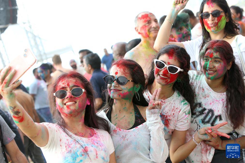 3月13日,人们在泰国芭堤雅的洒红节庆祝活动上拍照留念。